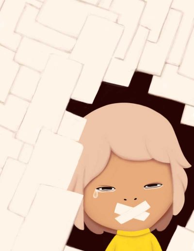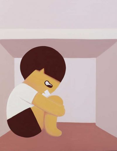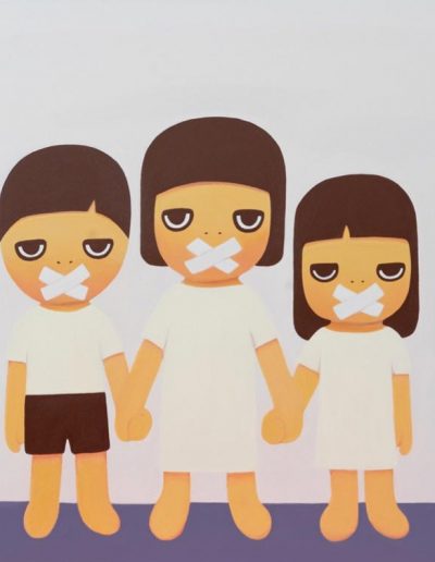 What really drives my practice are emotions and storytelling.The concept of my painting in itself arises from my own experience and my view of society in which we are often unable to say what we want or express who we are, be it for the worse or for the better but almost always at the cost of our own happiness. Symbolized through taped mouth, the child figures to reflect our real innocence self, light or dark background that represents emptiness within.