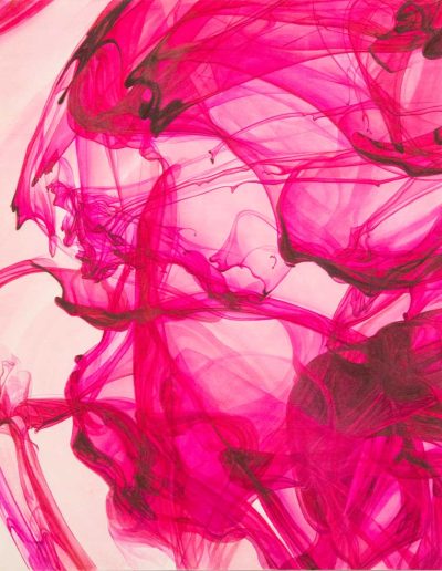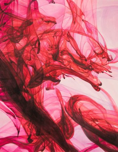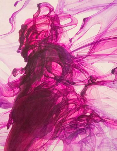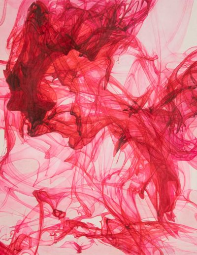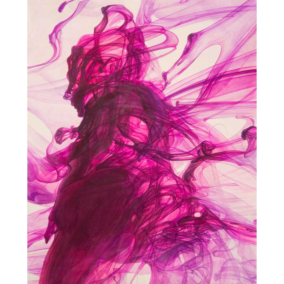 水中に落ちた墨が偶然、人形の模様を取った瞬間の写真をモチーフに日本画の技法を用いた絵画を制作している。
