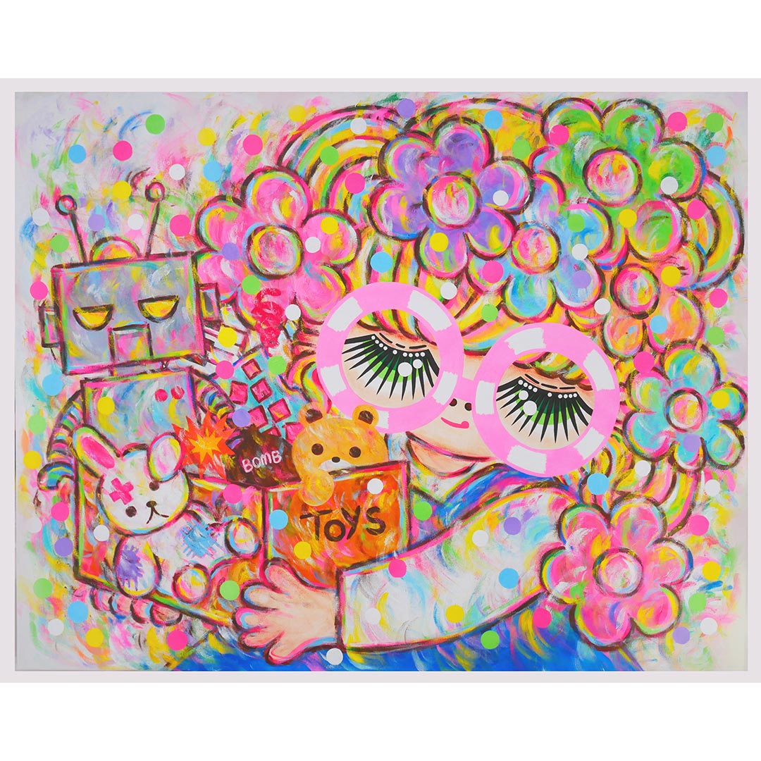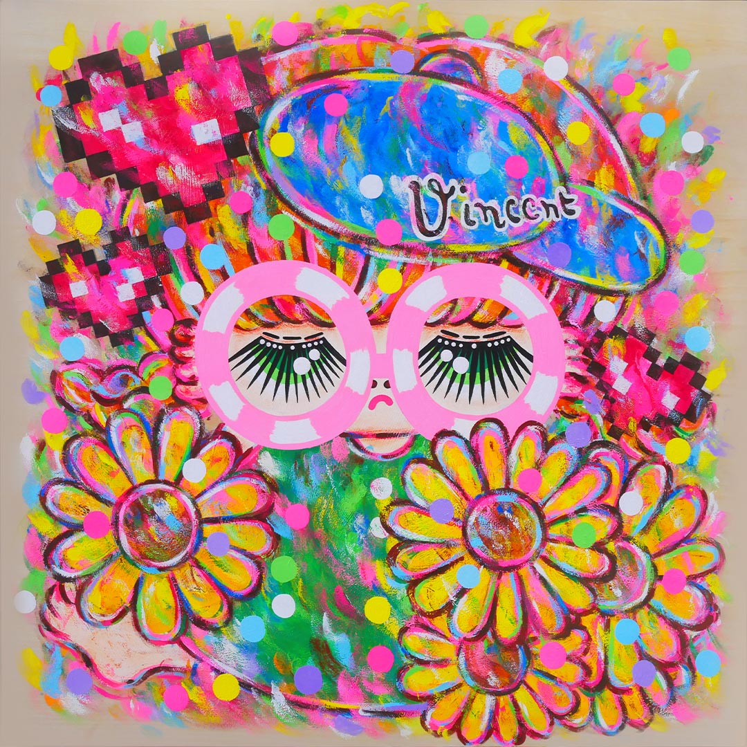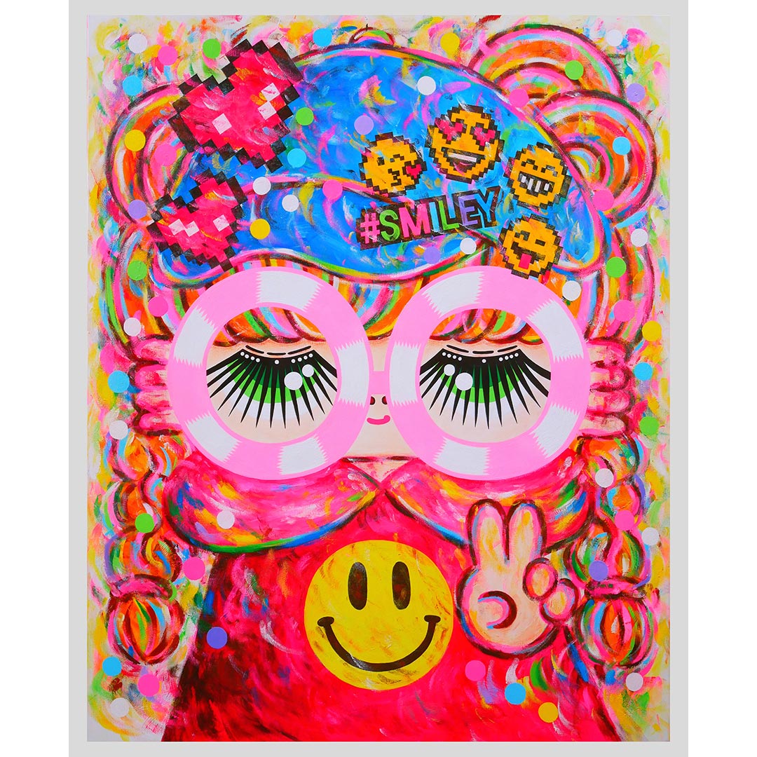 作品の多くがカラフルで可愛らしい少女が必死に何かを訴えようとするモチーフ。日本独自の「少女マンガ」や「ポップカルチャー」表現をベースに可愛らしさと息苦しさが同居する世界観を発信。アプロプリエーション手法を取り入れ、シンプルでリアルな世界が表現される。