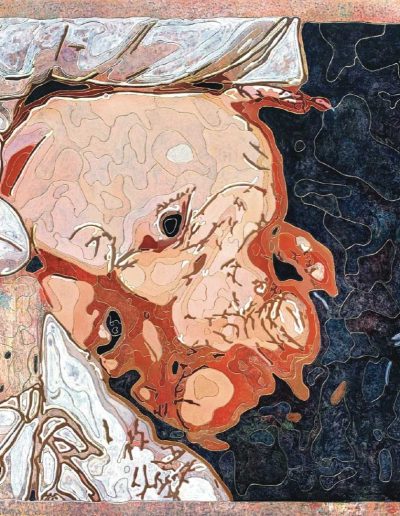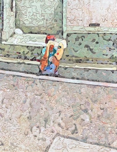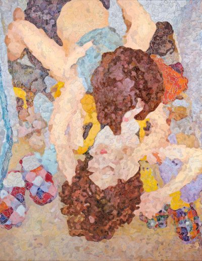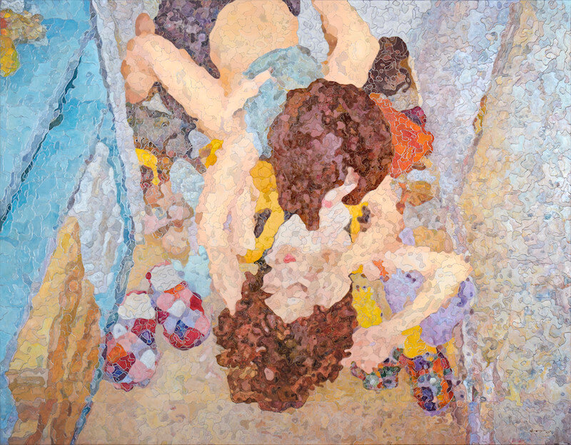 小林の作品は一見、個人の閉鎖的情景を描いているように思われますが、そのテーマは自他の表裏一体性です。モザイクスタイルを用いることで匿名性を高め、自己と他者を隔つ境界線をぼかす試みが行われています。
