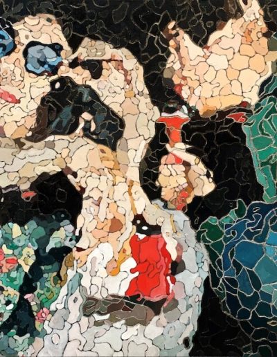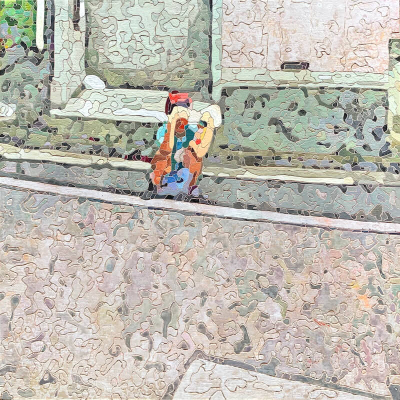 小林望美のモザイク画は、石や、ガラス、貝殻などの小片を寄せ合わせてつくる装飾美術技法ではなく、デジタル映像を再生した時に生じたブロックノイズや、低解像度の写真・画像から着想を得て変遷してきました。