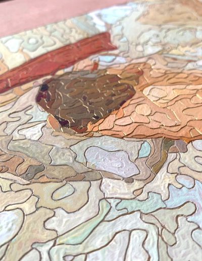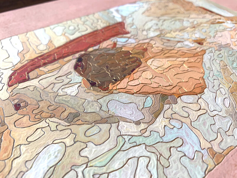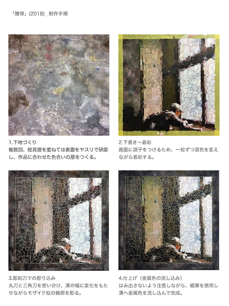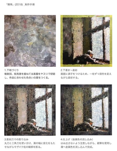 一度破壊し断片化された絵(画面)を再構成・修復する試みから、彫刻してできた溝へ金属色の絵の具を用い、金継ぎを模した仕上げを施す作品も手掛けている。