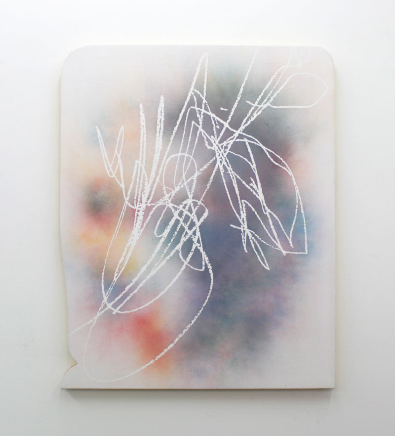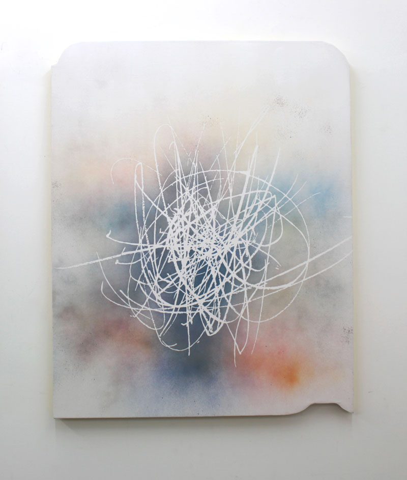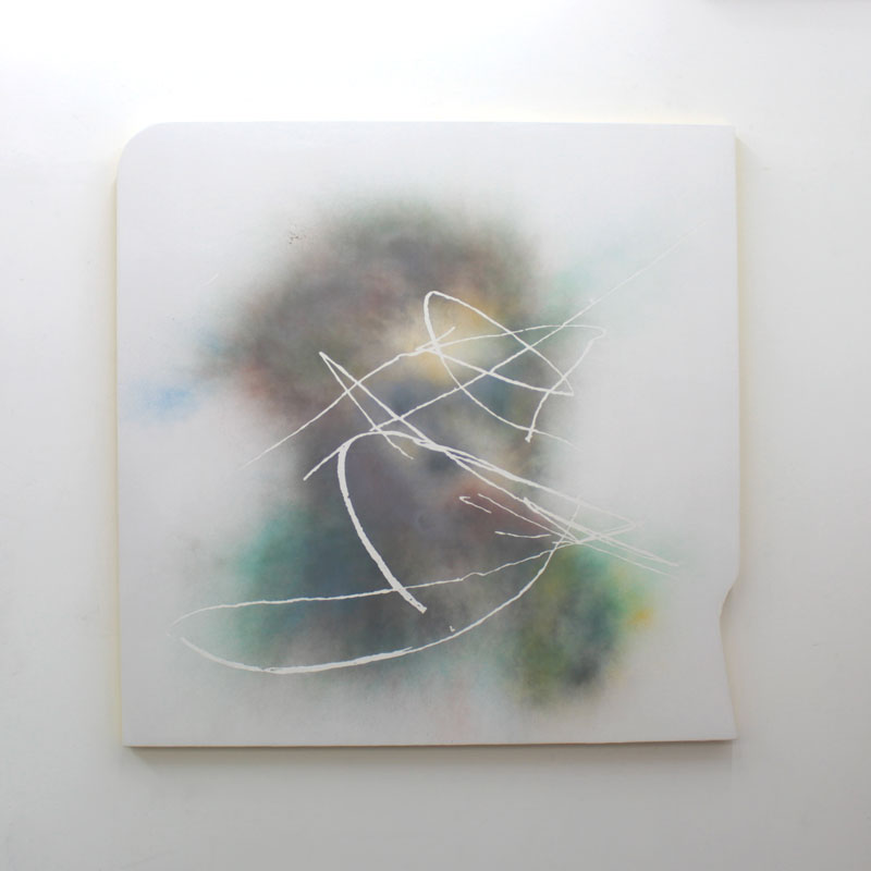 最近ではシェイプドキャンバスを用いている。それは与えられた四角の自由度の中で表現していることへの脱却のための試みである