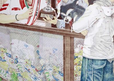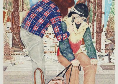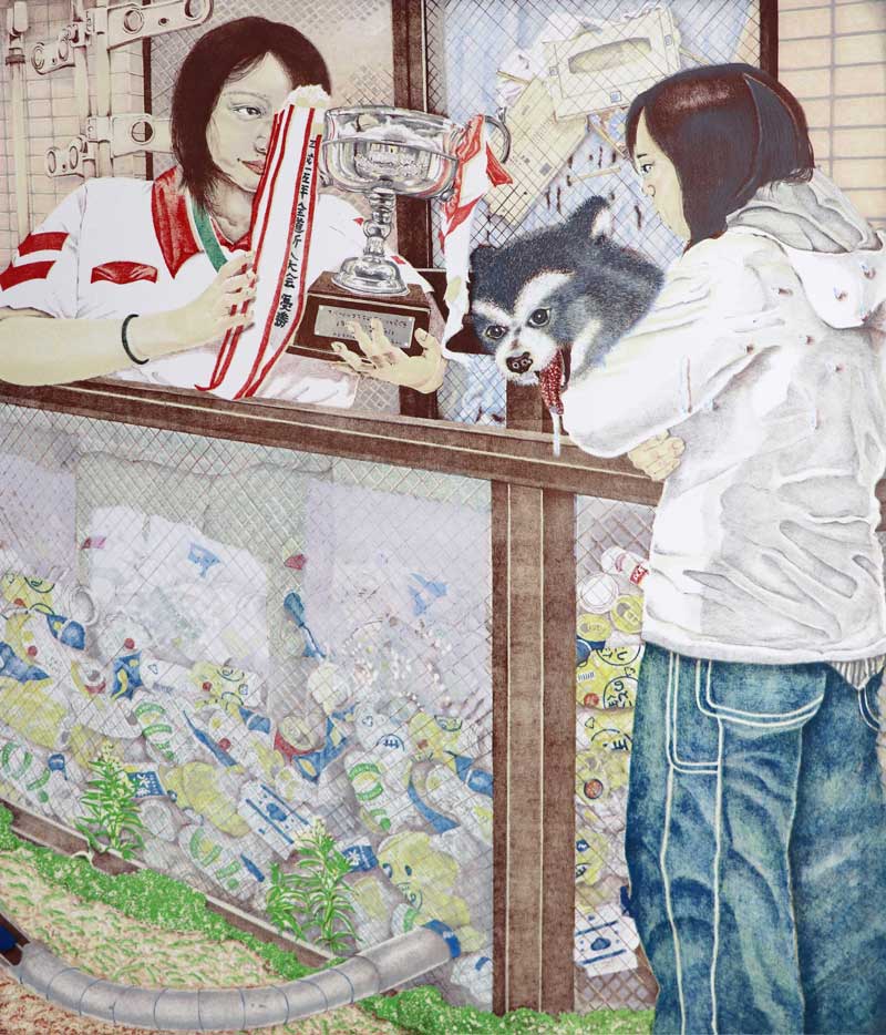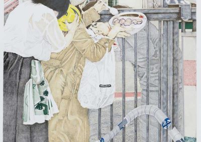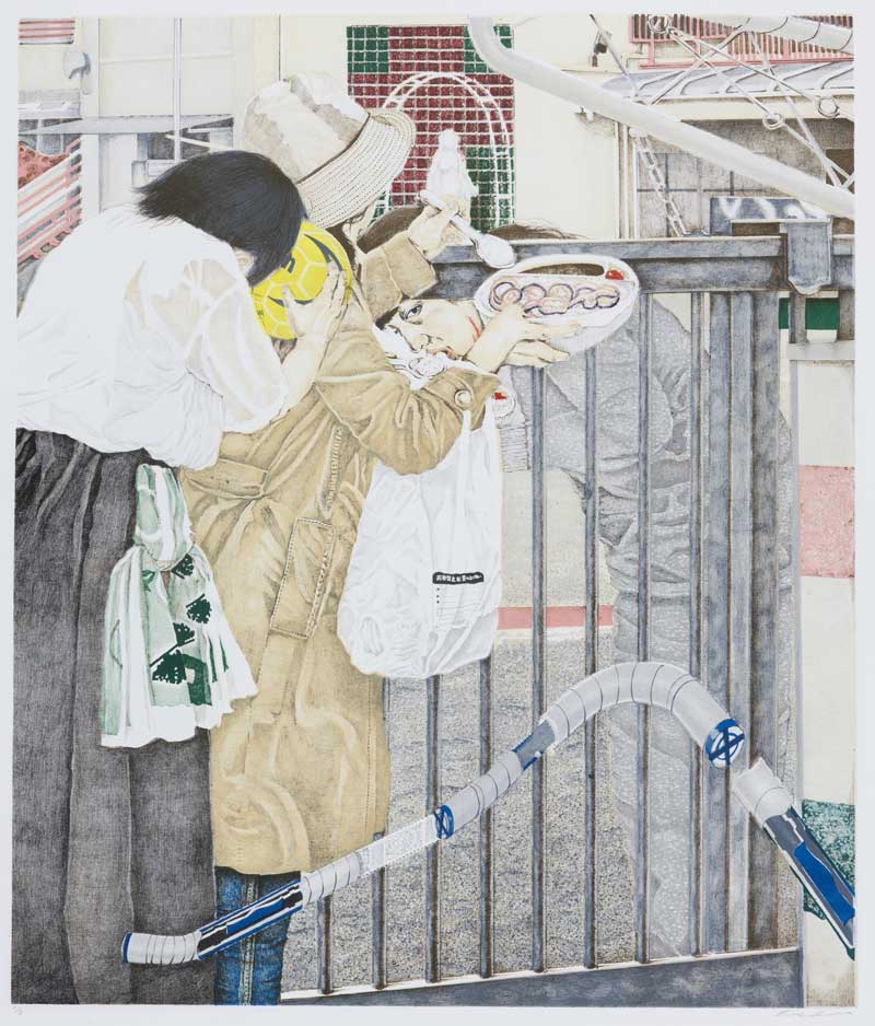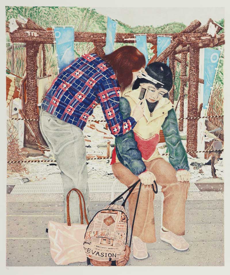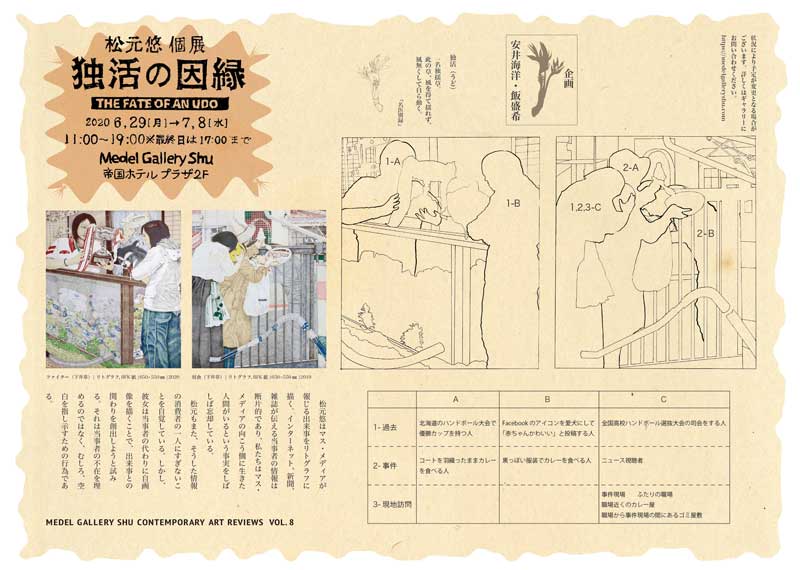 松元悠はマス・メディアが報じる出来事をリトグラフに描く。インターネット、新聞、雑誌が伝える当事者の情報は断片的であり、私たちはマス・メディアの向こう側に生きた人間がいるという事実をしばしば忘却している。