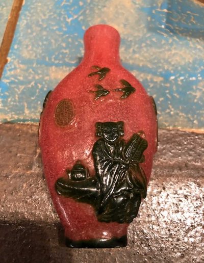 鼻煙壺素材もまたさまざまに分化し金や銀や錫の金属製・玉や瑪瑙等の貴石の鼻煙壺や、白磁などの陶器や硝子やエナメル彩・象牙等々、ありとあらゆる素材がこの小さな壺、鼻煙壺に使用されました。