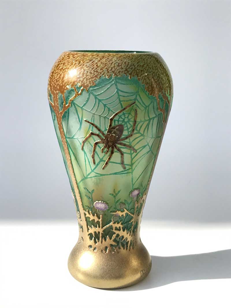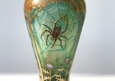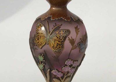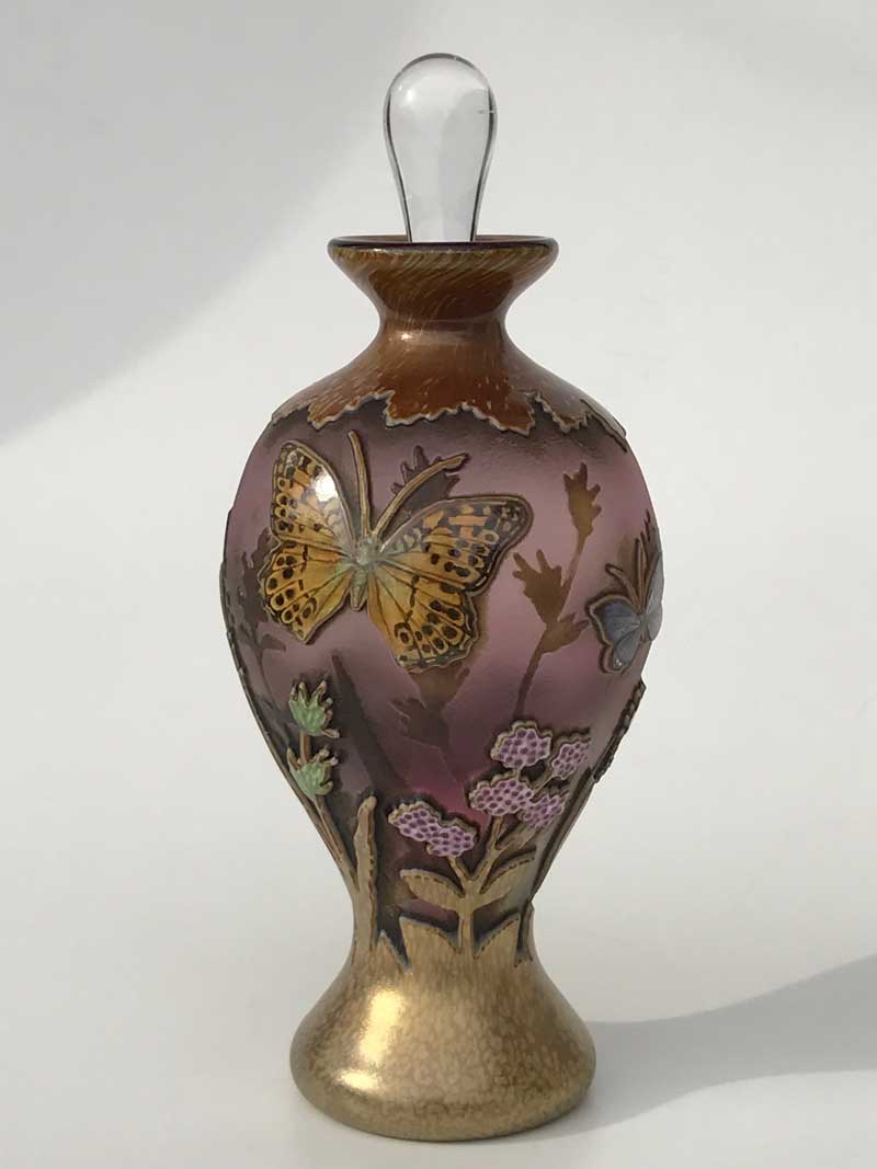 エナメル絵付けとは、二千年程前にローマで始められた技法で、色ガラスの微細粉を溶き油で練ったものを絵の具とし、絵付け後、焼き付けをする技法です。