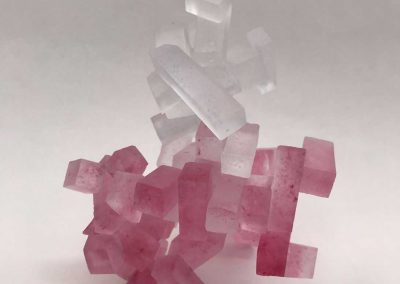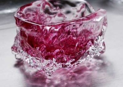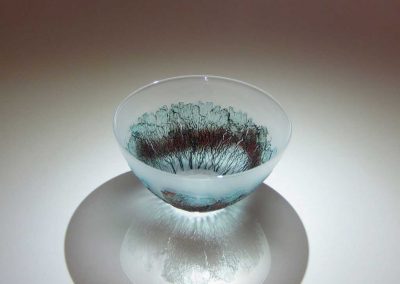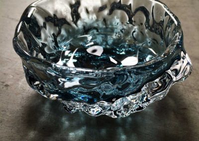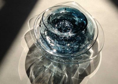 切子のキラキラとした光の反射や映り込み、削って鏡面まで研磨した面に覗き見るガラスの中の不思議な世界に魅力を感じ模索制作しています。