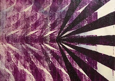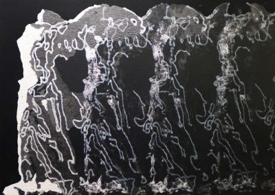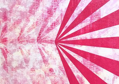 現在取り組んでいる「Reiterate(繰り返す、反復する)」シリーズは、自作のローラーを使ってイメージをアナログに反復するもので、絵具の消費や乾燥とともに徐々にイメージが掠れていくなど、不可避の変化や偶然性、身体を通して生まれる連続性を新たなイメージの創出につなげている。