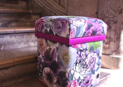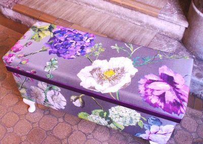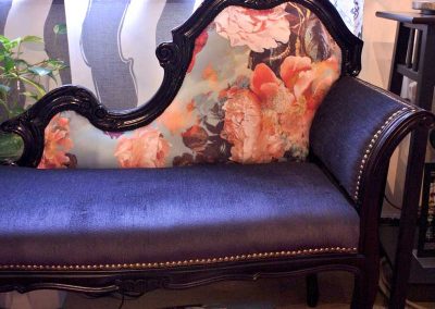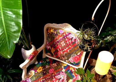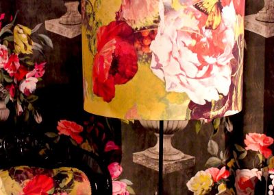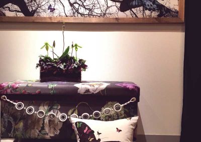 ファブリックをメインにした和洋の茶箱を中心に、ランプシェード、パネル、カーテン、アームチェアなどホームインテリアに独自の世界観を表現。目を引くようなカラーコーディネートや独特の素材感が魅力です。
