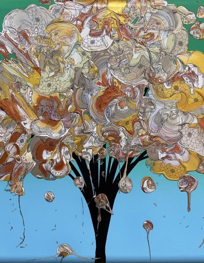 タイトルにもなっている代表的なシリーズ「with gratitude」では、普段は意識することはない当たり前に感謝することをテーマにそえ、同時に鑑賞者への感謝を伝えるため、絵画を献花と見立て、花をモチーフとした作品に仕上げています。混ざり合う絵具から生まれる偶発性、そしてペンによる緻密な必然性を織り交ぜ、そうした偶発的に訪れる不条理や困難な状況を必然へと、つまり自分の意志によって切り開くことをイメージしています。